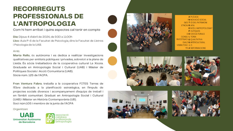 From the Department of Anthropology of the UAB, within the framework of the Seminar of External Practices and the Catalan Association of Anthropology Professionals (ACPA) we have organized the following talk on professionalization to which we invite you and hope that you will attend the teachers and students of the Department.
