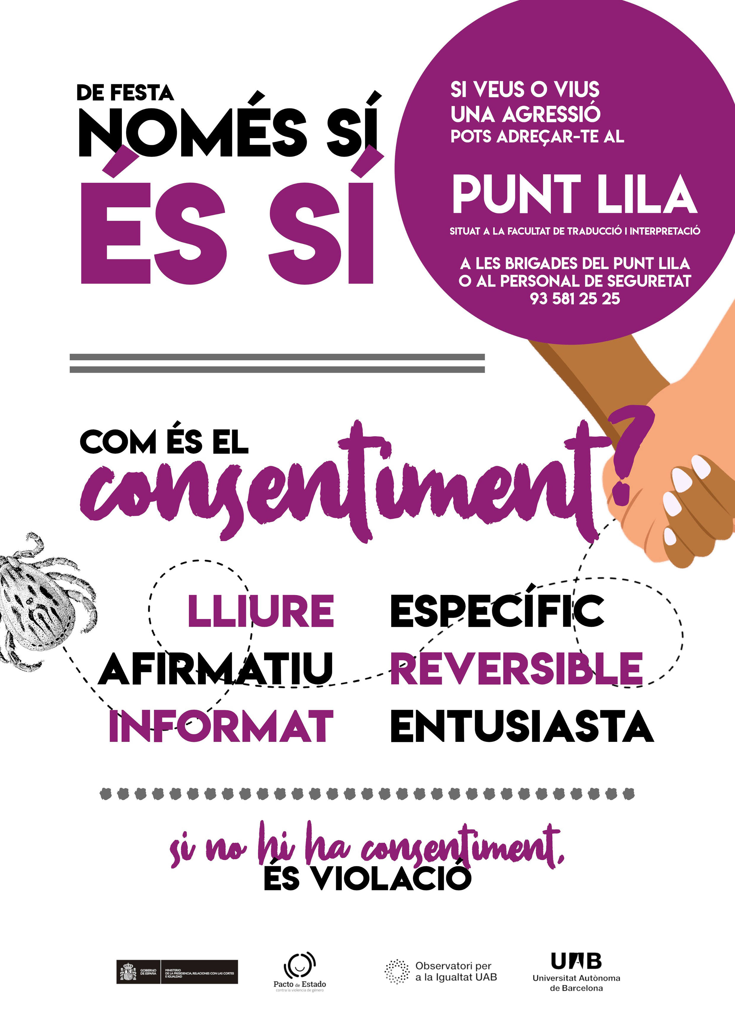 The Purple Point has two specialists on approaching misogynistic and queerphobic violence cases and providing the appropriate care, who are available from 12:00 to 16:00. The student body also collaborates in pairs with the Purple Point as “Purple Point Brigades”, informing of the UAB’s protocols and resources to approach cases of misogynistic violence and offering the initial care and accompaniment of the victim of aggression in possible cases of aggression or harassment. If you want to be part of the Brigades, we convene a un training course every instance of la Comunitària.