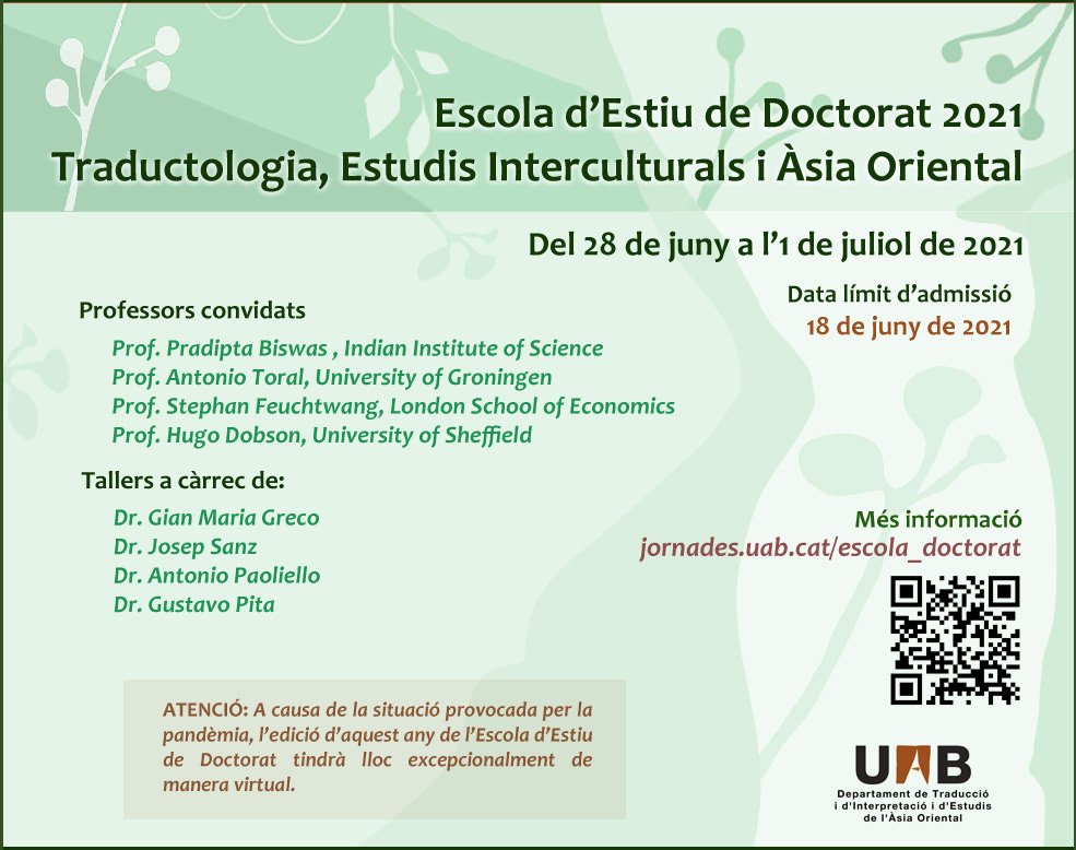 L'Escola d’Estiu de Doctorat és una iniciativa del Departament de Traducció i d'Interpretació i d'Estudis de l'Àsia Oriental de la Universitat Autònoma de Barcelona que enguany se celebrarà de manera virtual del 28 a l’1 de juliol del 2021. S’obren les inscripcions, amb places limitades, fins el 18 de juny.