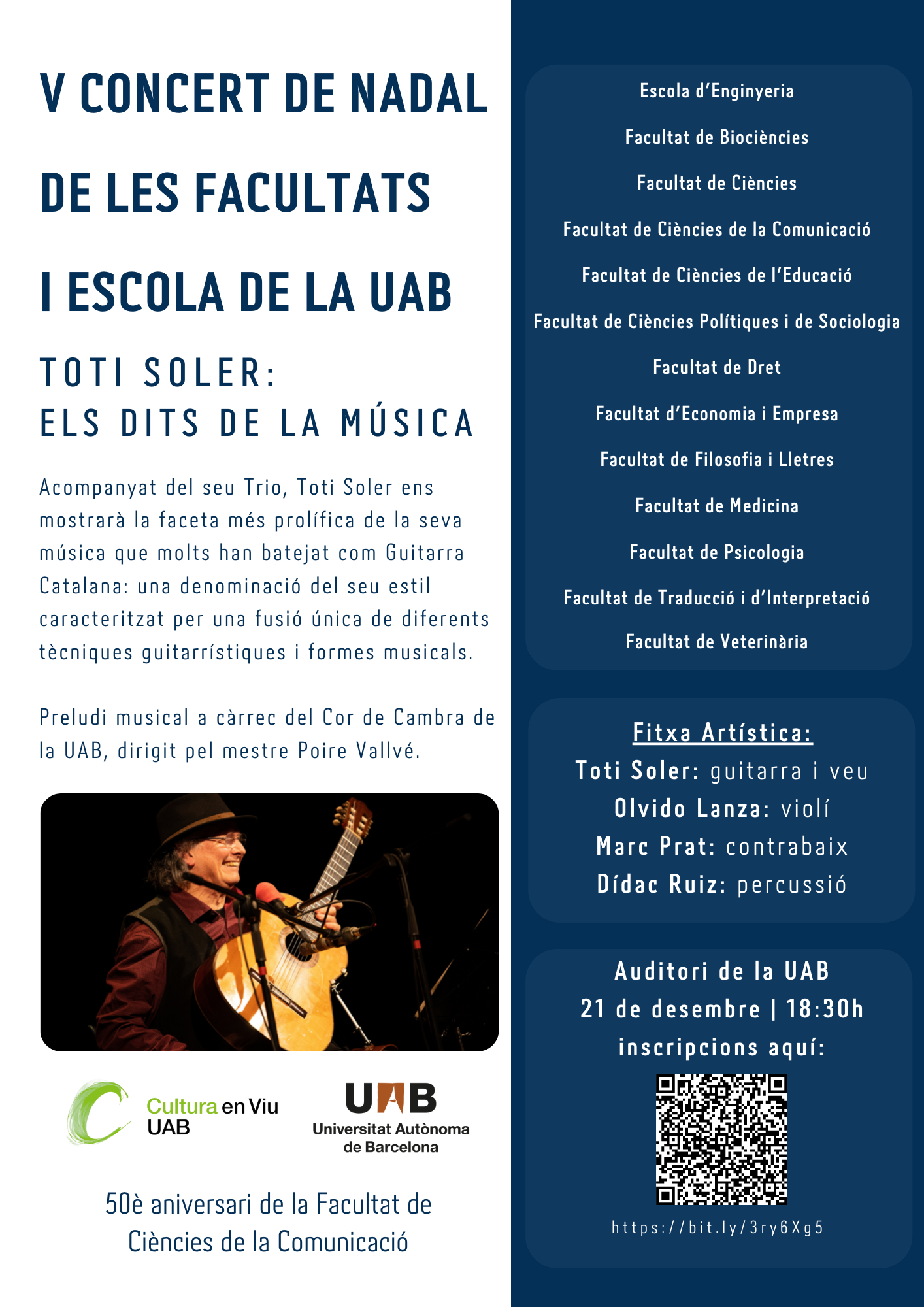 El martes, 21 de diciembre, las doce facultades y la Escuela de Ingeniería de la UAB organizan la quinta edición del concierto de Navidad para toda la comunidad universitaria. Tendrá lugar en el auditorio de la Facultad de Filosofía y Letras, a las 18,30 h. En el marco del concierto, se conmemorará también el 50.º aniversario de la Facultad de Ciencias de la Comunicación.