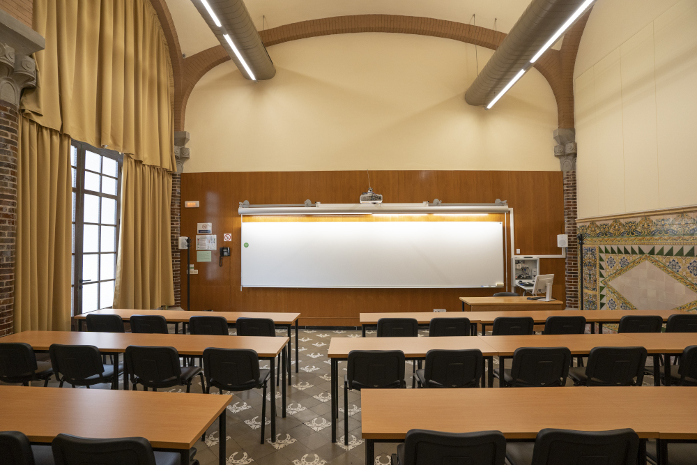 Aula singular con decoración de mosaicos modernistas y luz natural.