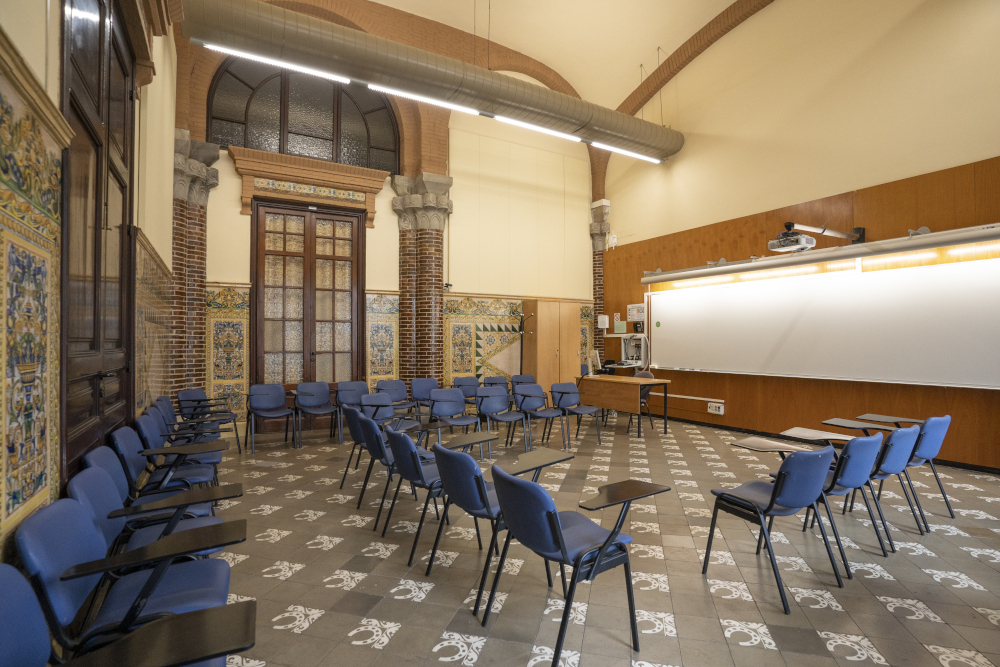 Aula singular amb decoració de mosaics modernistes i llum natural.